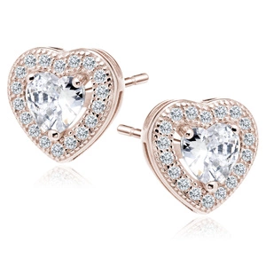 Srebrne pozłacane kolczyki pr.925 Cyrkonia biała - serca - różowe złoto
